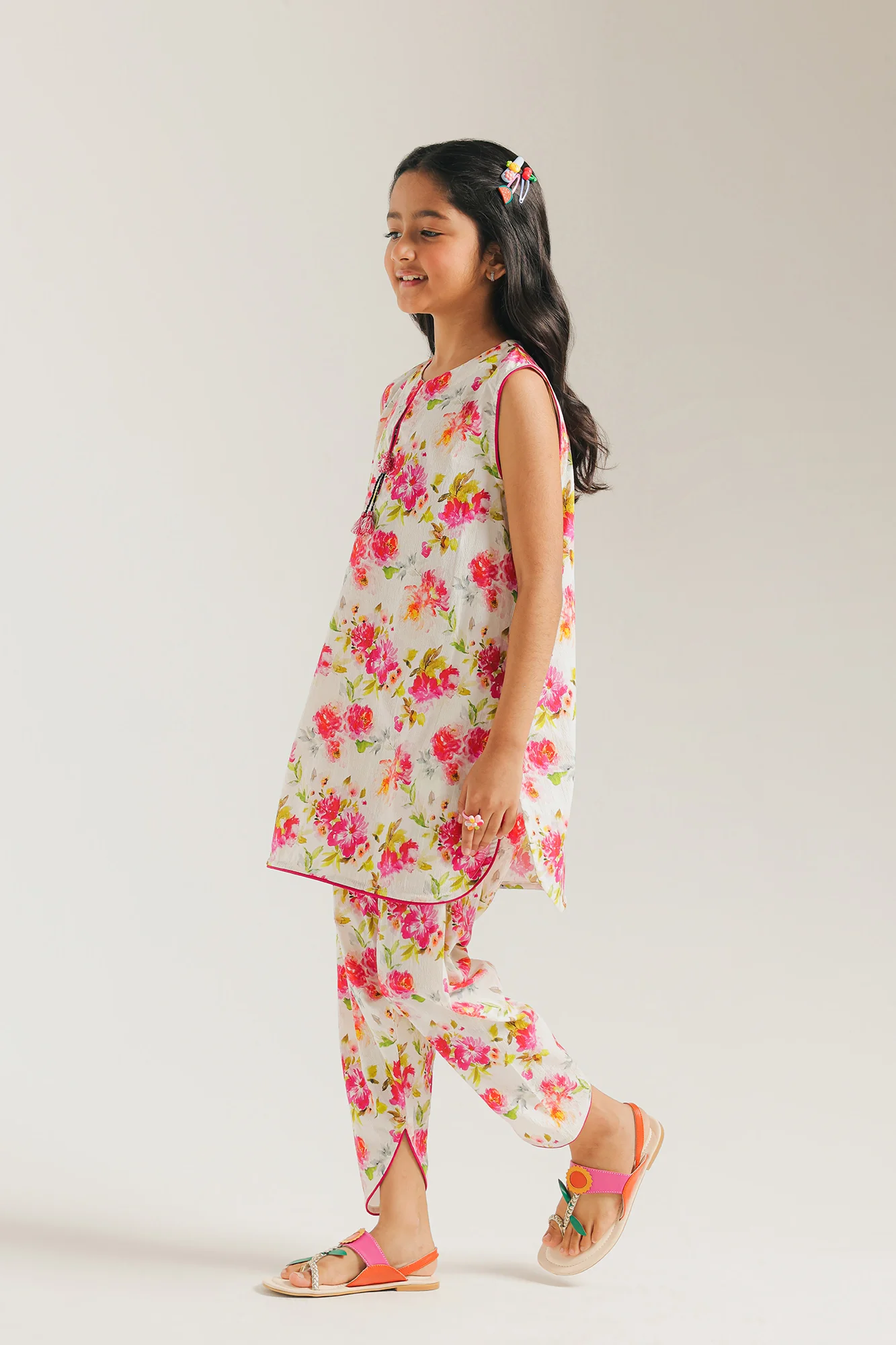 Adorn your little one in this vibrant printed suit. The sleeveless kurta features a charming floral pattern in shades of pink and red on a caramel off white background. The matching shalwar is designed for comfort and ease of movement, creating a delightful and stylish ensemble.