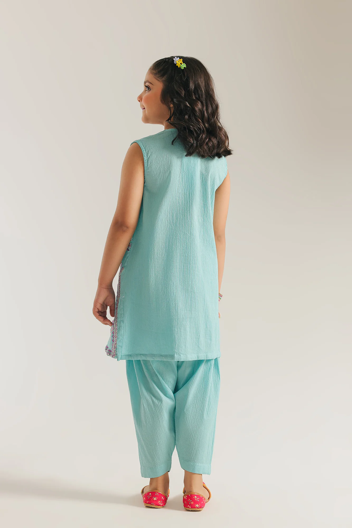 A vision of fresh and breezy style, this charming two-piece outfit is perfect for sunny days. The sleeveless light blue tunic is adorned with delicate, light pink and white floral embroidery, creating a look of sweet elegance. The outfit is completed with comfortable, solid light blue shalwar, making for an effortlessly coordinated and delightful ensemble.