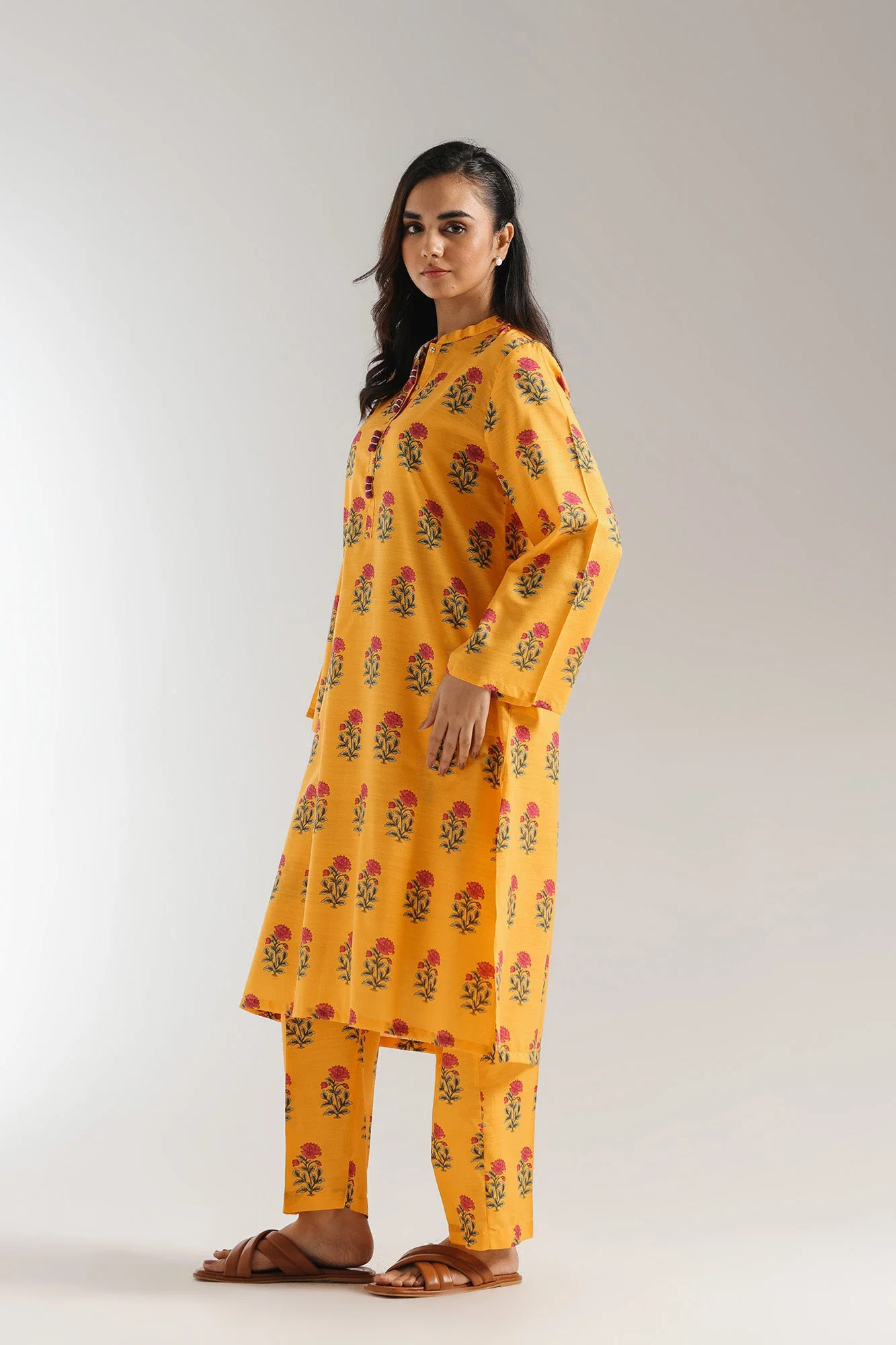 A contemporary composition is layered on this trendy silhouette shirt beautifully adorned with captivating artistic prints in vibrant colors portrayed on a vibrant mustard canvas. Paired with a matching trouser, this style statement outfit is a perfect option for you to embrace this spring season.