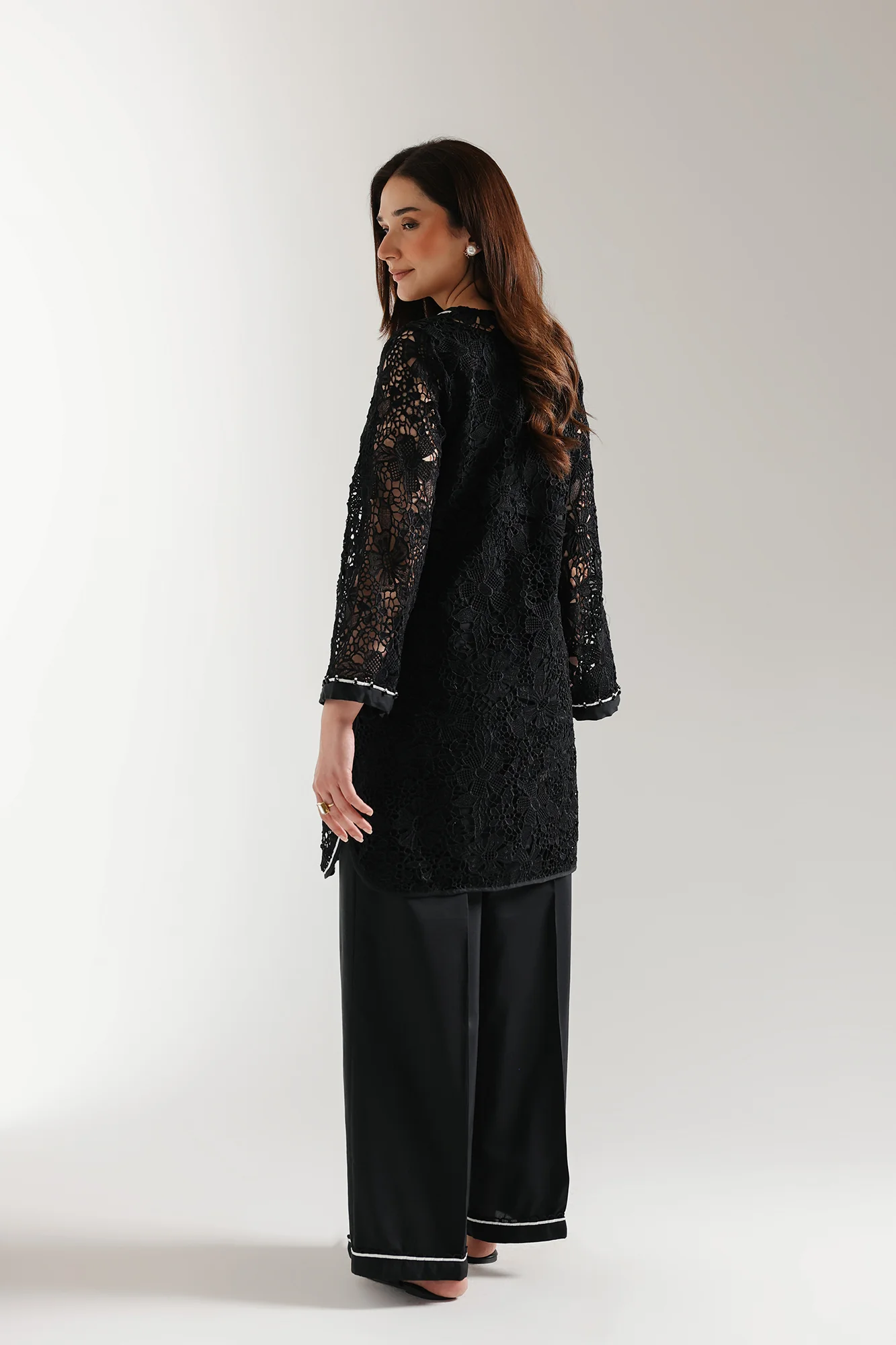 A style statement composition is layered on this graceful outfit rendered in a charming black shade. It features a contemporary shirt beautifully adorned with aesthetically rich floral designs with crochet fabric and enhanced with contrasted white fabric trims at neckline, sleeves and bottom opening. Paired with a solid inner slip and a contemporary culotte trouser. This enchanting outfit is the epitome of grace and perfection to style this happening season.